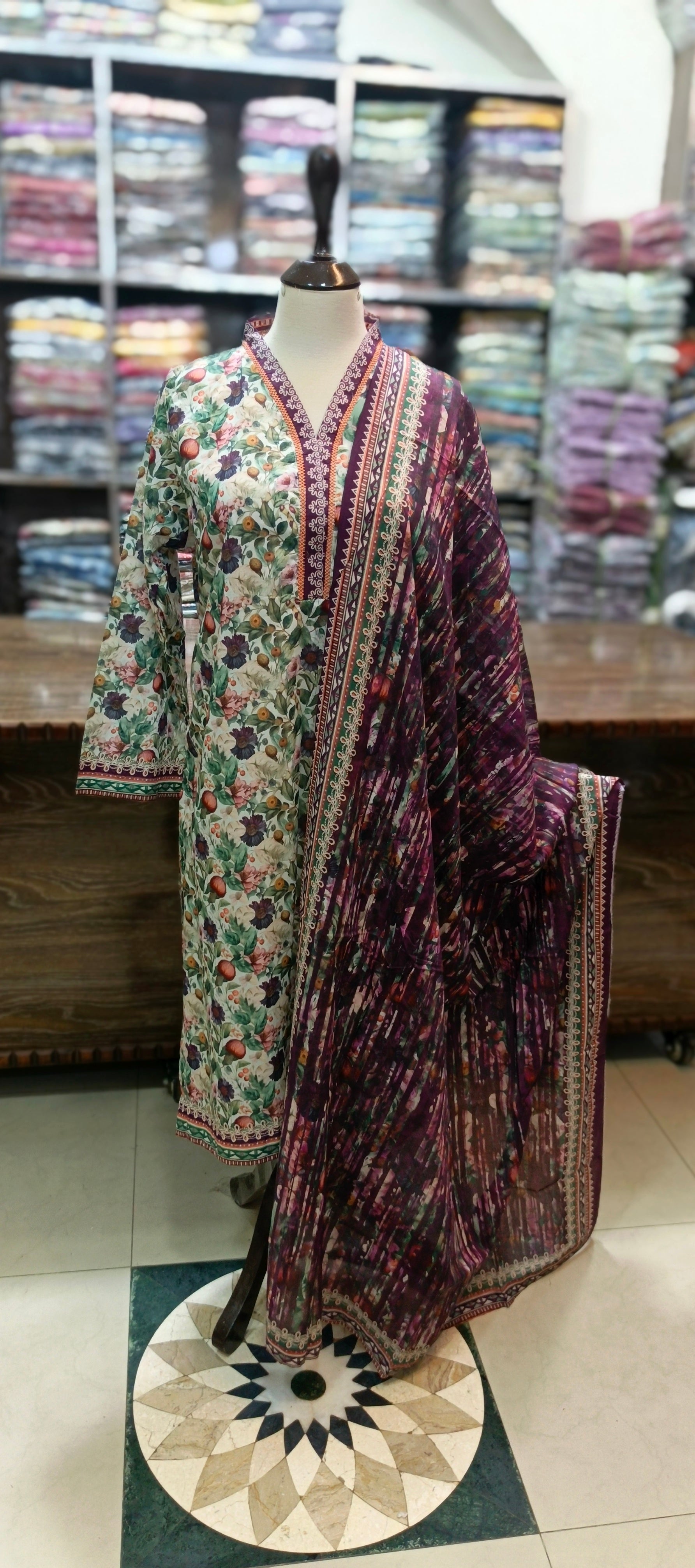 Enhance your wardrobe with our expertly tailored bin saeed premium lawn stiched shalwar kameez 3 pc set. Made from premium lawn this stitched pairs offers both style and comfort. A versatile addition to your collection, perfect for any occasion.chadder 2.5 meter