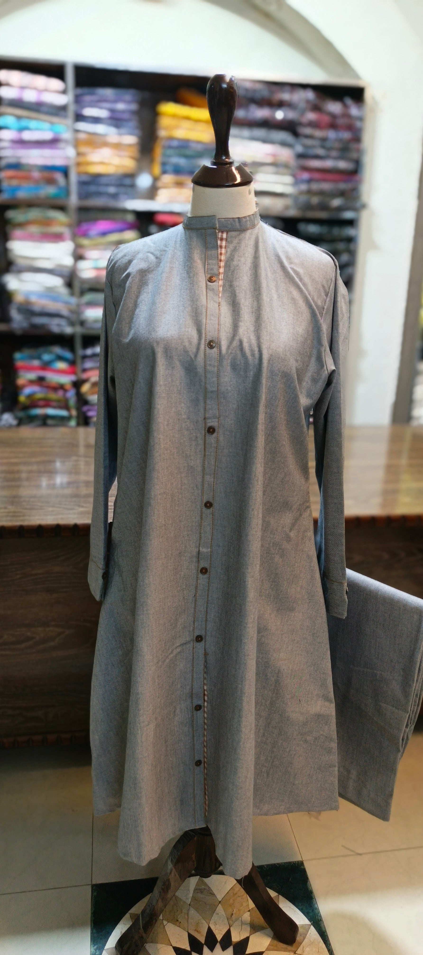 Crafted from premium denim fabric, this 2-piece set features a front open style with a stiched design for added style. Complete with a side pocket and trousers for a coordinated look. Perfect for a polished and put-together outfit.