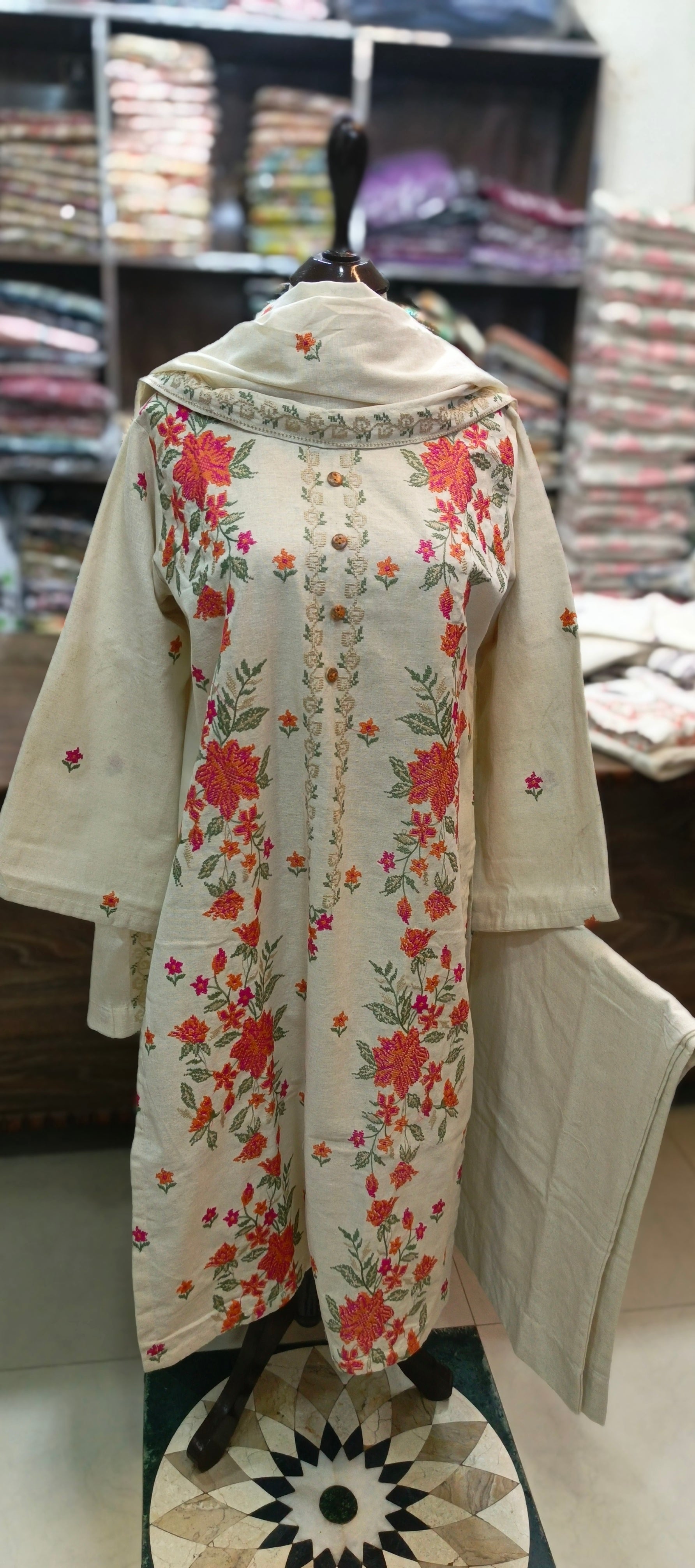 This 3 -piece KARANDI KHADDAR EMBROIDERED STICHED 3 PC features a 48-inch shirt and 38/39-inch trousers in a sleek, stitched style. With straight cut, this set offers a professional and sophisticated look. SHAWL EMBROIDERED OF 2.75 METER Made with high-quality KHADDAR, this set is both comfortable and durable