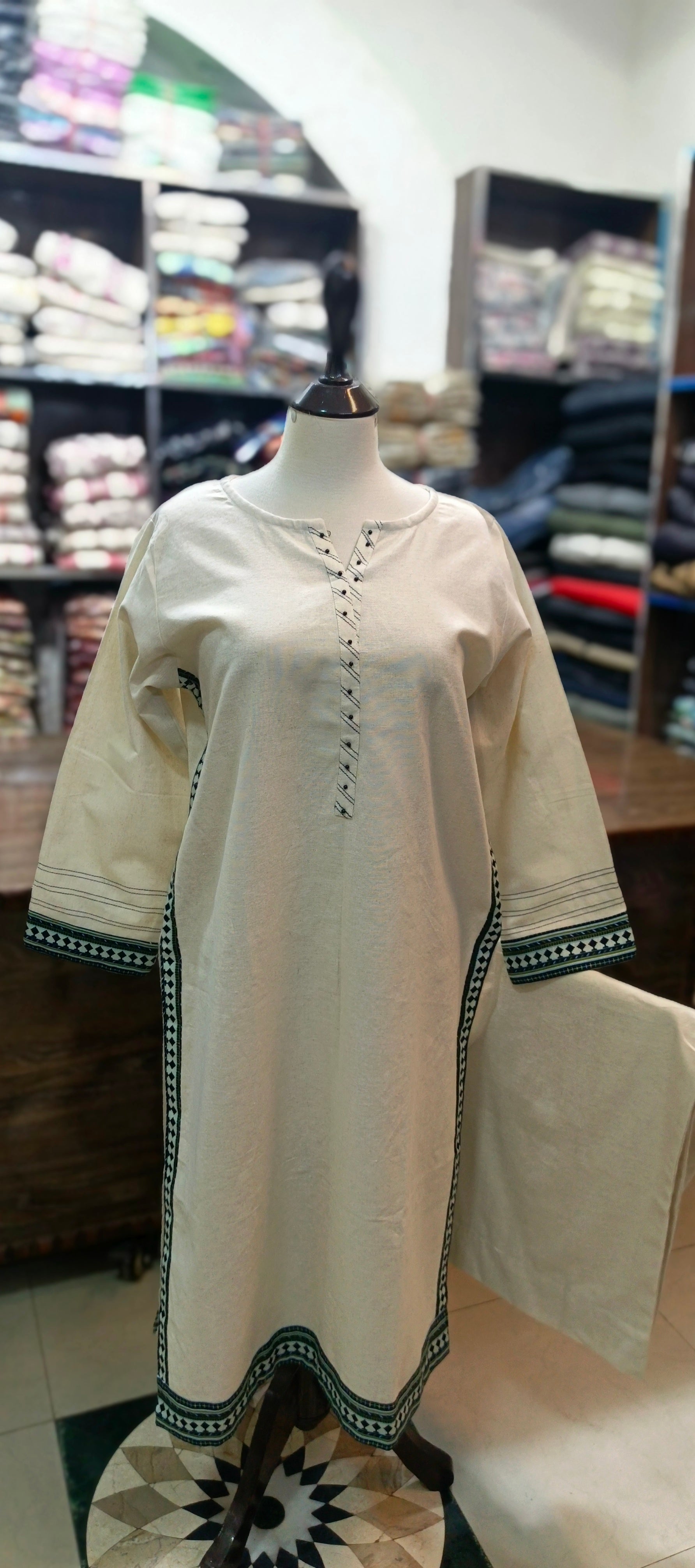 This 2 -piece KARANDIid summer EMBROIDERED STICHED 2 PC features a 48-inch shirt and 38/39-inch trousers in a sleek, stitched style. With straight cut, this set offers a professional and sophisticated look. Made with high-quality karandi fabric, this set is both comfortable and durable